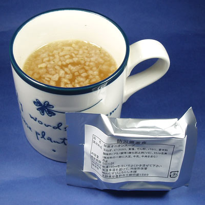 お湯を注いでできあがりっ!防災用5年保存非常食即席オニオンスープ×6食パック 価格: 787円 レビュー評価: 5.0 レビュー数:1 原材料名 玉ねぎ、ビーフエキス、食塩、澱粉、パセリ、香辛料、調味料(アミノ酸等)、酸化防止剤(VE)、カラメル色素 ※原材料の一部に大豆・牛乳・牛肉を含む 内容量 1パック6g入り(調理前) × 6食セット 賞味期限 製造日より5年 調理に必要なお湯の量 160ml アルミ製の日光を遮断する袋に入っているので、保管も安心です。 (ただし高温多湿を避け、冷暗所で保管してください) 箸・スプーンやおわんなどは入っていませんので、別途ご用意下さい。 ? 店長の試食 ? 見た目ほど脂っこくなく、食欲をそそる香りがなんとも言えませんo(^?^)o 細かいオニオンが意外に多く入っていて、嬉しい! お湯を注 Supported by 楽天ウェブサービス |