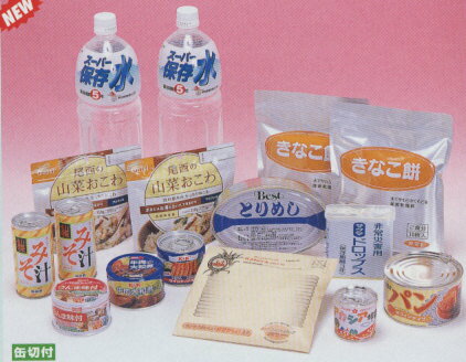 保存食バラエティセット【防災用品/非常食】 価格: 5,407円 レビュー評価: 3.0 レビュー数:1 《商品の特長》1.缶詰弁当(とりめし)2.アルファ米(山菜おこわ100g×2袋)3.きなこ餅(2袋)4.ビスケット5.パンの缶詰6.はちみつ缶7.みそ汁缶(2本)又はカップ付みそ汁(2個)8.缶詰(牛肉大根煮・ウインナ?・さんま味付)9.スーパー保存水(1.5リットル×2本)10.ドロップス●缶切付き 箱入/約360×200×200mm Supported by 楽天ウェブサービス |